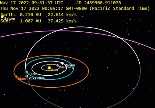Asteroid je dobio oznaku 2022 RM4 i putuje prema Zemlji, no nije prijetnja. Kreće se brzinom od 83.761 km/h te će 1. novembra proći pored Zemlje na udaljenosi od 2.297.822 kilometara.