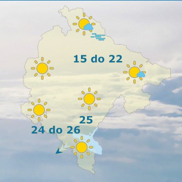 Danas će u Crnoj Gori biti pretežno sunčano. Na sjeveru, ujutru, po kotlinama magla, a tokom dana ponegdje slab do umjeren razvoj oblačnosti. Vjetar uglavnom slab do umjeren, dominantno sjevernih smjerova. Najviša dnevna temperatura vazduha od 15 do 26 stepeni, saopšteno je iz Zavoda za hidrometeorologiju.