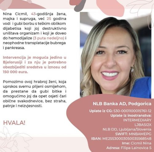 Podgoričanki Nini Cicmil (43) potrebno je 150.000 eura za transplatacije bubrega i pankreasa u inostranstvu. Naime, Nina Cicmil je diplomirani ekonomista, radila je u Ekektrodistribuciji Crne Gore 15 godina, a onda silom zdravstvenih prilika otišla u prijevremenu penziju, saopšteno je iz NVO Karika.