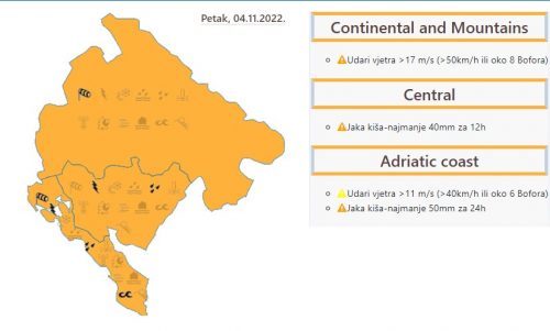 – Tokom jutra biće postepeno naoblačenje, koje će tokom dana usloviti mjestimično kišu ili pljuskove i grmljavinu, češće u južnim i centralnim predjelima. Najviše padavina se očekuje krajem dana i tokom noći, kada će nešto više kiše biti i u sjevernim predjelima. Mjestimično će duvati umjeren do jak vjetar južnih smjerova, ponegdje na udare i veoma jak. Najviša dnevna temperatura vazduha od 11 do 20 stepeni, saopšteno je iz Zavoda za hidrometeorologiju.