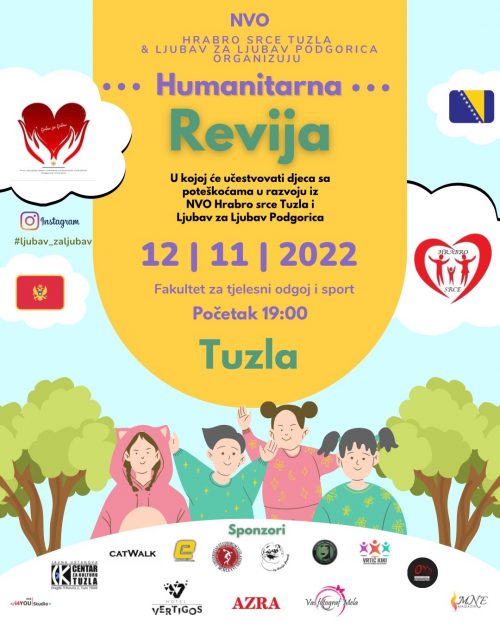 Humanitarna revija za djecu s poteškoćama u razvoju biće održana u subotu, 12. novembra, sa početkom u 19 sati, u Tuzli, na Fakultetu za tjelesni odgoj i sport, u organizaciji udruženja za djecu i omladinu sa Daunovim sindromom ,,Ljubav za ljubav” iz Crne Gore i udruženja ,,Hrabro srce” iz Tuzle.