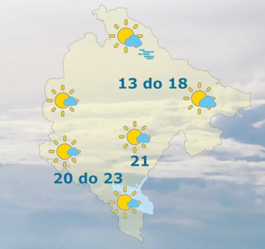 Danas će u Crnoj Gori biti malo do umjereno oblačno, uz dosta sunčanih intervala. Na sjeveru po kotlinama ujutru ili prijepodne, magla i sumaglica. Vjetar slab promjenljivog smjera, tokom noći ponegdje umjeren sjeverni. Najviša dnevna temperatura vazduha od 13 do 23 stepena, saopšteno je iz Zavoda za hidrometeorologiju.