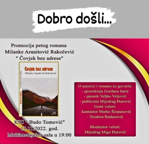 Promocija petog romana Milanke Aranitović – Rakočević ,,Čovjek bez adrese” biće održana 15. novembra u Multimedijalnoj sali KIC-a ,,Budo Tomović” u Podgorici sa početkom u 19 sati.