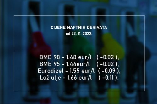 BMB 98 i BMB 95 biće jeftinije za dva centa, pa će BMB 98 koštati 1.48 eura po litru, a BMB 95 1.44 eura po litru. Eurodizel će pojeftiniti devet centi i koštaće 1.55 eura po litru, dok će lož ulje biti jeftinije za 11 centi i stoga koštati 1.66 eura po litru.