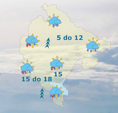 Danas će u Crnoj Gori biti pretežno oblačno, povremeno sa kišom, pljuskovima, ponegdje i grmljavinom, a u višim planinskim predjelima, na sjeveru, moguć i slab snijeg ili susnježica. Intenzivnije padavine se očekuju u popodnevnim i noćnim satima, mjestimično umjerene ili obilne količine. U jutarnjim satima na sjeveru po kotlnama mjestimično magla. Vjetar južnih smjerova, pojačan i jak, na udare i olujne jačine. Najviša dnevna temperatura vazduha od 5 do 18 stepeni, saopšteno je iz Zavoda za hidrometeorologiju.