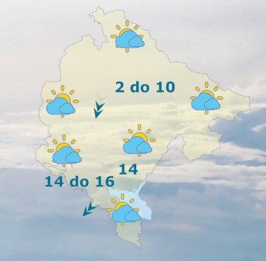Danas će u Crnoj Gori biti umjereno do potpuno oblačno, tokom noći na sjeveru susnježica i slab snijeg, a na primorju ponegdje moguća slaba kiša. Vjetar mjestimično umjereno do jak, sjeverni i sjeveroistočni. Najviša dnevna temperatura vazduha od 2 do 16 stepeni, saopšteno je iz Zavoda za hidrometeorologiju.