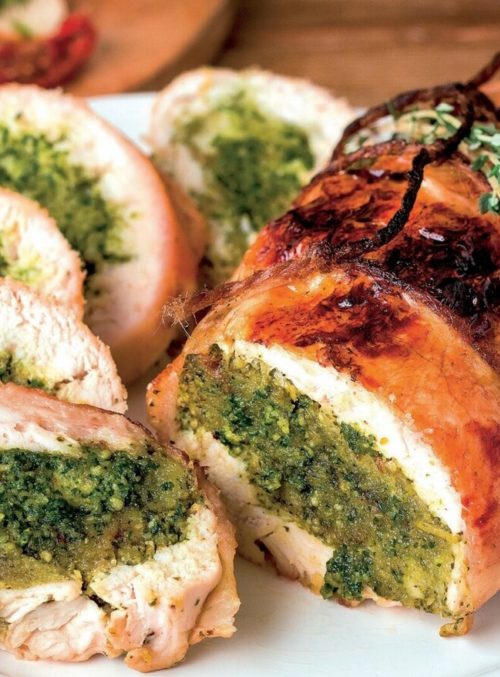 Meso raširite i od njega napravite veliku šniclu. Posolite ga i pobiberite. U secku dobro usitnite bosiljak, bijeli luk, parmezan i maslinovo ulje, pa ovom smjesom premažite meso. Dobro ga urolajte, ako treba vežite kanapom, pa uvijte šnitama slanine. Meso stavite u pleh, nalijte supom, prekrijte folijom, pa pecite oko sat vremena na 200 stepeni. Skinite foliju, pa nastavite da pečete dok meso ne dobije rumenu boju. Kada se malo prohladi, isijecite ga na šnite.