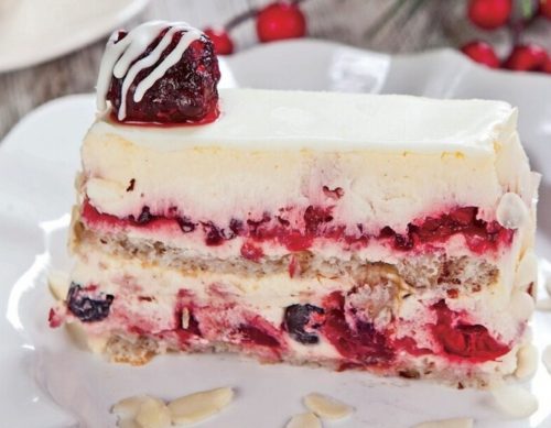 Za kore pjenasto umutite bjelanca. Posebno umutite žumanca, šećer, sjeckane bademe, brašno i liker od badema, pa im lagano dodajte umućena bjelanca i dobro promiješajte. Smjesu podijelite na dva dijela, pa ispecite dvije kore na 180 stepeni oko 20 minuta. Za fil umutite žumanca sa gustinom i malo mlijeka, pa uz neprestano miješanje sipajte ih u kipuće mlijeko kome ste dodali šećer. Kuvajte na pari oko 5 minuta dok se ne zgusne. U prohlađen fil dodajte umućen puter, pa dobro sjedinite. Kore naizmjenično filujte šumskim voćem i mliječnim filom. Ukrasite po želji.