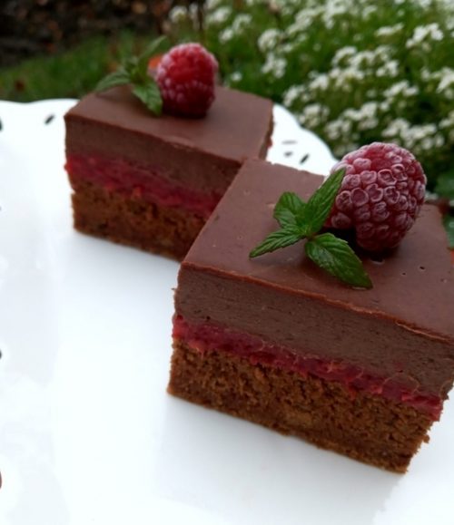 Maline staviti da se kuvaju sa šećerom i vodom. Ako su maline zaleđene onda dodajte 100 ml vode. Dva pudinga od vanile razmutite sa malo vode i dodajte u skuvane maline, miješajte dok se ne zgusne. Gotov fil prelijte preko kore. Ostavite malo da se ohladi i stavite ganach krem. Gotov kolač ostaviti na sobnoj temperaturi da se ohladi, a potom u frižider na par sati. Najbolje preko noći i služiti.