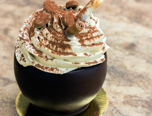 Na pari otopite čokoladu sa maslacem i vodom, pa prespite u staklenu posudu i dobro promiješajte da se prohladi. Naduvane balone umačite dopola u rastopljenu čokoladu i odlažite ih na ravnu površinu da se čokolada stvrdne i oblikuje. Svaki balon umočite dva puta. Kada se čokolada na balonu ohladi, polako ispustite iz njih vazduh i odvojte ih od čokolade. Za to vreme skuvajte puding, dok je topao, umešajte maslac, a kada se sasvim ohladi, umešajte i umućen šlag krem. Rasporedite fil u korpice od čokolade i ukrasite šlag krem sprejom. Pospite čokoladom u prahu i dekorišite po želji.