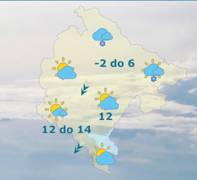 Danas će u južnim predjelima Crne Gore biti promjenljivo oblačno, sa sunčanim intervalima. Na sjeveru umjereno do potpuno oblačno, mjestimično sa uglavnom slabim snijegom. Vjetar, mjestimično umjeren do jak, sjevernih smjerova. Najviša dnevna temperatura vazduha od -2 do 14 stepeni, saopšteno je iz Zavoda za hidrometeorologiju.
