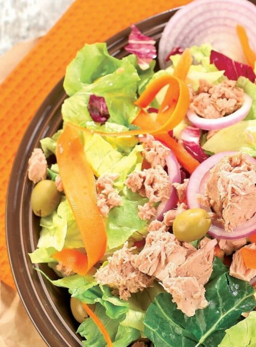 Salatu i blitvu operite i iscjepkajte rukama. Šargarepu oljuštite, pa je ljuštilicom izrežite na tanke trake. Crveni luk isijecite na rebarca, sve promiješajte, pa dodajte masline i tunjevinu. Maslinovo ulje, sok od limuna, so i peršun stavite u teglicu, dobro promućkajte i prelijte salatu.