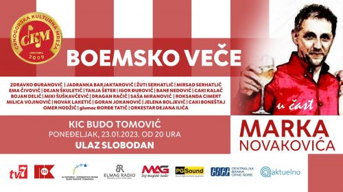 Boemsko veče u čast nedavno preminulog crnogorskog novinara, urednika i publiciste Marka Novakovića koje organizuje NVO ,,Crnogorska kulturna mreža” biće održano u ponedjeljak, 23.januara u velikoj sali KIC-a ,,Budo Tomoavić” od 20 sati, saopšteno je iz PR službe KIC-a.