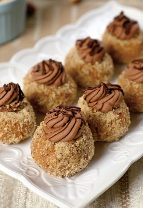U osnovnu smjesu dodajte 100 grama mljevenih lješnika i zamijesite. Od smjese pravite kuglice željene veličine i svaku uvaljajte u preostale mljevene lješnike. Svakoj kuglici napravite udubljenje vrhom drške varjače i u nju nanesite ohlađen i umućen ganaš krem. Za ganaš otopite pavlaku sa čokoladom, dobro ohladite i mikserom umutite. Napunite dresir kesu i ukrašavajte kuglice.