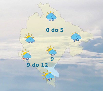 Danas će u Crnoj Gori biti pretežno oblačno, sa kišom, mjestimično pljuskovi, na jugu ponegdje i grmljavina, a u višim planinskim predjelima, uglavnom, snijeg i susnježica. Ponegdje umjerene ili obilne padavine. U popodnevnim satima u južnim i dijelom centralnim predjelima postepen prestanak padavina i djelimično razvedravanje. Vjetar slab do umjeren, promjenljivog smjera, u jutarnjim satima umjeren do pojačan, istočni i jugoistočni. Najviša dnevna temperatura vazduha od 1 do 12 stepeni, saopšteno je iz Zavoda za hidrometeorologiju.