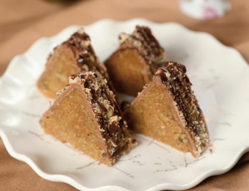 U osnovnu smjesu dodajte krupnije samljevene orahe, đumbir i cimet i sve dobro umijesite. Ako nemate poseban trouglasti kalup, stavite providnu foliju u dublji pleh, pa duž jedne strane stavite dobijenu smjesu i rukama oblikujte piramidu. Uvijte u foliju i dobro ohladite. Zajedno otopite crnu i bijelu čokoladu, prelijte ohlađen kolač i blago pospite orasima.