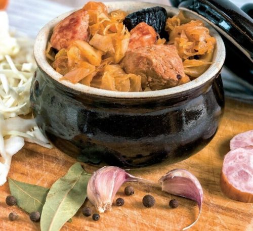 Crveni i bijeli luk sitno isjeckajte i pržite na ulju na umjerenoj temperaturi u velikom tiganju ili šerpi dok ne omekša. Zatim dodajte oprane cijele suve šljive, listove lovora i biber u zrnu, pa pržite nekoliko minuta uz stalno miješanje. Kupus ocijedite, ukoliko je previše slan, operite, stavite ga u tiganj sa šljivama i lukom i pržite 10 minuta, sve vreme miješajući. Dodajte suvo meso, sve prespite u dublji pleh ili zemljanu ili vatrostalnu posudu, nalijte oko 4 dl vode, prekrijte folijom i pecite sat i po na 180 stepeni, sklonite poklopac ili foliju i pecite još 45 minuta.