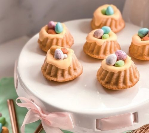 Otopite bijelu čokoladu sa nemućenom slatkom pavlakom, lagano, lijepo umiješajte i dodajte trunčicu boje po ukusu i prelijte ivice kuglofa. Ako koristite samo malo slatke pavlake, dobićete gušću smjesu koja se neće prelivati niz ivice puno. U sredinu sipajte bombonice i dobijate malena uskršnja gnijezda.
