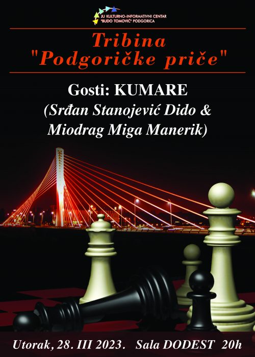 Tribina ,,Podgoričke priče” u martu će ugostiti poznati dvojac Kumare koji su posljednjih godina promovisali i popularisali podgorički i crnogorski humor, ali na originalni način, koji nije puka zabava, već satira koja se tiče svakoga, navodi se u saopštenju PR službe KIC-a ,,Budo Tomović”.