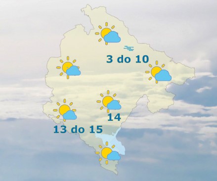 Danas će u južnim i centralnim predjelima Crne Gore biti duži sunčani periodi. Na sjeveru nešto više oblaka, a tokom jutra ponegdje po kotlinama moguća magla. Vjetar uglavnom slab do umjeren, u južnim predjelima promjenljivog smjera, a na sjeveru zapadni i sjeverozapadni. Najviša dnevna temperatura vazduha od 3 do 15 stepeni, saopšteno je iz Zavoda za hidrometeorologiju.