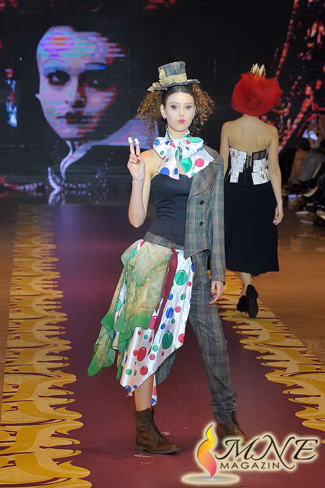 Uz muziku i scene iz filma ,,Alisa u Zemlji čuda” koje su se smjenjivale na bimu, povele su gledaoce na putovanje sa Alisom. Prva je na pistu izašla ,,mala” Alisa u plavoj haljini sa bijelim karnerima i velikom bijelom mašnom na leđima, a odmah za njom pojavila se manekenka u bijeloj haljini na kojoj je bio sat i ,,zečjim ušima”. Smjenjivale su se kreacije, označavajući likove i detalje iz bajke, bijeli kombinezon sa plaštom, bijela haljina sa kapuljačom i plavim detaljima, pozlaćena haljina, ,,Ludi šeširdžija” u kaputu, uz crnu haljinu išao je i crni povez preko oka, a tu je bio i crveni šešir.