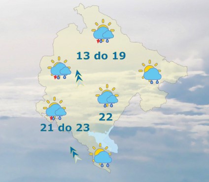 Danas će u Crnoj Gori biti pretežno oblačno, povremeno slaba do umjerena kiša, tokom noći u južnim i zapadnim predjelima i pljuskovi sa grmljavinom. Vjetar mjestimično umjeren do jak, južni i jugoistočni. Najviša dnevna temperatura vazduha od 13 do 23 stepena, saopšteno je iz Zavoda za hidrometeorologiju.