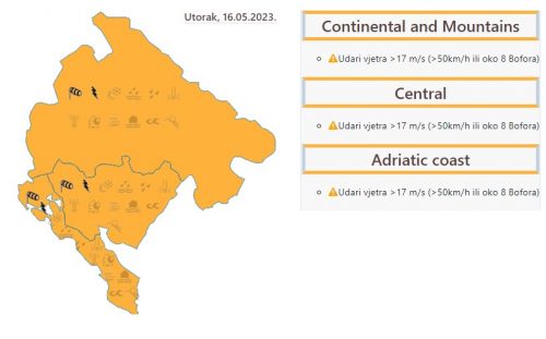 Za cijelo područje Crne Gore izdat je narandžasti meteoalarm. Očekuje se jak vjetar.
