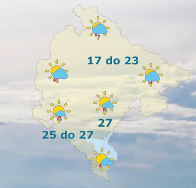 Danas će u južnim predjelima Crne Gore biti malo do umjereno oblačno sa dužim sunčanim intervalima, a na sjeveru promjenjivo oblačno. Od sredine dana mjestimično kiša ili kratkotrajan pljusak praćen grmljavinom, prvenstveno u kontinentalnim predjelima i na području Boke. Ujutru, ponegdje moguća magla. Vjetar slab do umjeren, uglavnom sjevernih smjerova, tokom noći ponegdje pojačan. Najviša dnevna temperatura vazduha od 17 do 28 stepeni, saopšteno je iz Zavoda za hidrometeorologiju.