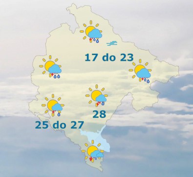 Danas će u Crnoj Gori biti promjenjivo, toplo i nestabilno, uglavnom od sredine dana, mjestimično kiša, lokalno pljuskovi praćeni grmljavinom. Više uslova za padavine u kontinentalnim predjelima, a ponegdje su moguće i kratkotrajne vremenske nepogode praćene gradom i jakim udarima vjetra. Najviša dnevna temperatura vazduha od 17 do 28 stepeni, saopšteno je iz Zavoda za hidrometeorologiju.