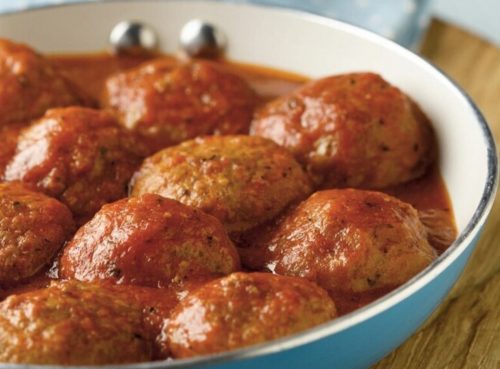 Sve navedene sastojke za ćufte stavite u činiju i dobro ih umijesite rukom tako da se sve sjedini. Dobijenu smjesu ostavite u frižideru dok pripremate sos. Sitno isjeckajte crni luk i propržite ga na malo ulja, dodajte sok od paradajza i po potrebi malo vode, pa sve začinite. Kada paradajz proključa, izvadite smjesu i od nje oblikujte malene ćufte koje će se brže skuvati. Jednu po jednu spuštajte u paradajz-sos, poklopite i kuvajte 15 minuta. Dok se ćuftice kuvaju, pripremite kupus salatu.