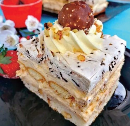 Mutite bjelanca uz postepeno dodavanje šećera dok ne dobijete čvrst snijeg. Brašno prosijte, pa sa praškom za pecivo lagano umiješajte u snijeg od bjelanaca. Na kraju umiješajte mljeveni lješnik. Kalup sa otvarajućim stranicama 34x 22 cm obložite papirom za pečenje i rasporedite smjesu. Pecite 20 minuta na 180 stepeni, pa biskvit malo prohladite i nakvasite mlijekom uz pomoć četkice. Izmutite žumanca sa šećerom i vanilom, pa dodajte gustin i malo hladnog mlijeka, te dobro izmiješajte. Smjesu ulijte u provrelo mlijeko i neprestano mutite dok se ne zgusne. U ohlađen krem umutite omekšali margarin i na kraju dodajte lješnike.