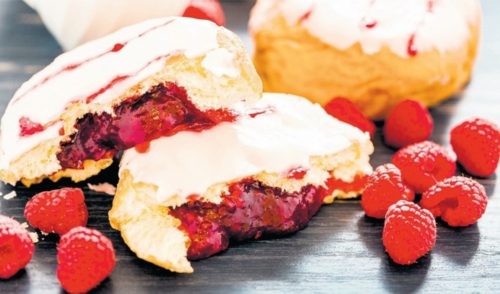 Zagrijte rernu na 200 stepeni i podmažite kalup za krofne ili mafine maslacem. Sve suve sastojke stavite u veliku činiju i promiješajte. Ostale sastojke izblendirajte. To će trajati nekoliko minuta zbog urmi. Pomiješajte obije smjese, pa ako treba, umutite. Maline izblendirajte u pire i njih na kraju umiješajte u tijesto. Razlijte ga u kalupe za mafine ili krofne i pecite deset minuta na 200 stepeni, smanjite na 180 i pecite još 8–10 minuta. Krofnice servirajte s malinama ili sa šlagom.