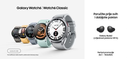 Čeka te sjajna ponuda, naruči Galaxy Watch6 prije svih i očekuje te sjajan poklon. Izaberi novi Galaxy Watch6 ili Watch6 Classic i na poklon dobijaš Galaxy Buds2. Vrijednost poklona iznosi 149 eura a promocija traje od 26.7. do 10.8.2023. Više informacija na linku: https://www.samsung.com/rs/offer/preorder-galaxy-watch6-mne/