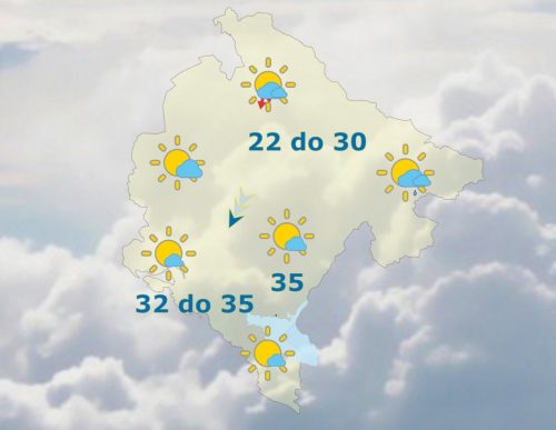 Danas će u južnim i centralnim predjelima Crne Gore biti pretežno sunčano, uz povremeno malu do umjerenu oblačnost. Na sjeveru promjenljivo oblačno sa sunčanim intervalima, ali ponegdje ima uslova i za kratkotrajnu kišu ili pljusak i grmljavinu. Vjetar slab do umjeren, ponegdje pojačan, sjevernih smjerova. Najviša dnevna temperatura vazduha od 22 do 35 stepeni, kazali su iz Zavoda za hidrometeorologiju.