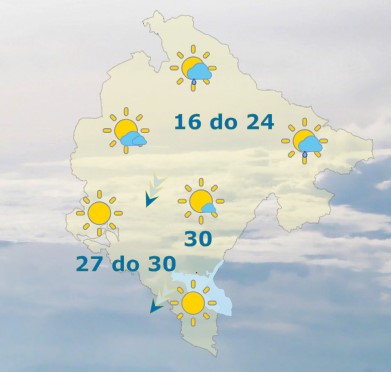 Danas će u južnim i centralnim predjelima Crne Gore biti pretežno sunčano. Na sjeveru, još tokom jutra, ponegdje moguća slaba kiša, a u popodnevnim satima razvedravanje. Vjetar mjestimično umjeren do jak, sjevernih smjerova. Najviša dnevna temperatura vazduha od 16 do 30 stepeni, saopšteno je iz Zavoda za hidrometeorologiju.