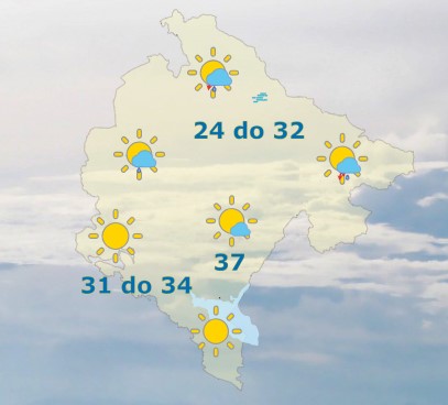 Danas će na jugu Crne Gore biti pretežno sunčano i toplo. Na sjeveru, promjenljivo oblačno sa sunčanim intervalima, ujutru po kotlinama, magla, tokom poslijepodneva uz pojačan razvoj oblaka, mjestimično slaba kiša ili pljusak i grmljavina. Vjetar uglavnom slab do umjeren, promjenljivog smjera. Najviša dnevna temperatura vazduha od 24 do 37 stepeni, saopšteno je iz Zavoda za hidrometeorologiju.