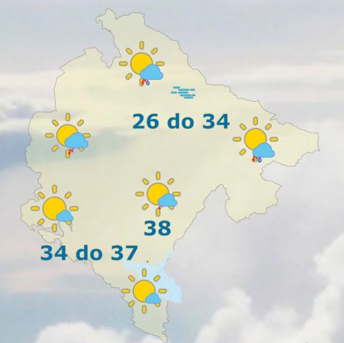Danas će u Crnoj Gori biti pretežno sunčano i veoma toplo. Poslijepodne i u večernjim satima, u kontinentalnim predjelima promjenljivo oblačno, ponegdje uz kišu ili pljusak sa grmljavinom, uglavnom, u sjevernim i centralnim oblastima. Vjetar slab promjenljivog smjera, povremeno umjeren do pojačan, sjevernih smjerova. Najviša dnevna temperatura vazduha od 26 do 39 stepeni, saopšteno je iz Zavoda za hidrometeorologiju.