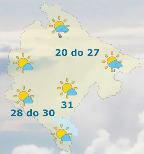 Danas će u Crnoj Gori u južnim i centralnim predjelima biti sunčano, uz povremeno malu do umjerenu oblačnost. Na sjeveru promjenljivo oblačno sa sunčanim intervalima, u drugom dijelu dana ponegdje moguća slaba kiša. Vjetar slab do umjeren, promjenljivog smjera. Najviša dnevna temperatura vazduha od 20 do 31 stepen, saopšteno je iz Zavoda za hidrometeorologiju.