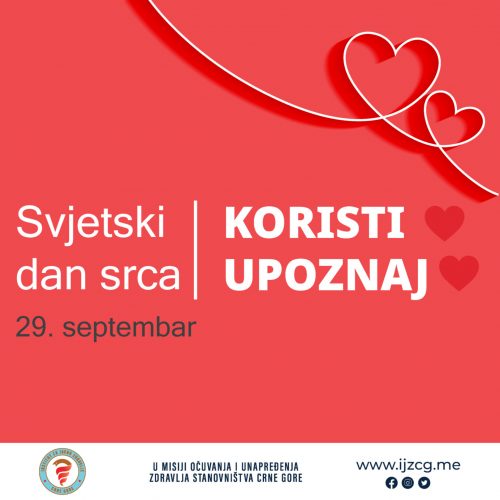 – Institut za javno zdravlje Crne Gore podržaće Svjetski dan srca promovisanjem ovog događaja na Sajmu medicine kroz ključne poruke kao i na svom sajtu i putem društvenih mreža. Izazivamo vas da, bar na ovaj dan hodate, trčite ili vozite bicikl u vašem gradu rutom koja bi bila u obliku srca. Koju god udaljenost da pređete, svaki korak je važan za zdravlje vašeg srca – zaključuje se u saopštenju IJZCG.
