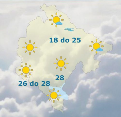 U Crnoj Gori danas će biti sunčano ili pretežno sunčano i tokom dana prijatno toplo vrijeme. Na sjeveru ujutru po kotlinama moguća kratkotrajno magla. Vjetar slab promjenljivog smjera, na primorju povremeno umjeren sjevernih smjerova. Najviša dnevna temperatura vazduha 18 do 28 stepeni, kazali su iz Zavoda za hidrometeorologiju.