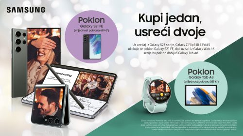 Samsung je pripremio posebnu ponudu gdje uz kupovinu uređaja iz Samsung Galaxy S23 ili Galaxy Z serije na poklon dobijate Galaxy S21 FE pametni telefon, dok uz sat iz Galaxy Watch6 serije na poklon dobijate Galaxy Tab A8. Ponuda traje od 12.10. do 12.11.2023. ili do isteka zaliha. Za više informacija o promociji posjetite link.