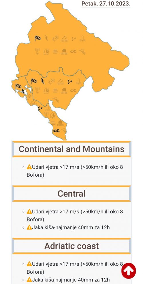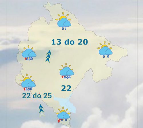 Danas će u Crnoj Gori biti umjereno do potpuno oblačno, povremno kiša, u popodnevnim satima mjestimično pljuskovi i grmljavina. U južnim i centralnim predjelima ponegdje umjerene do obilne količine padavina, dok će na krajnjem sjeveru i sjeveroistoku biti znatno manje kiše. Duvaće pojačan i jak, na udare i veoma jak, ponegdje i olujne jačine, južni i jugoistočni vjetar. Najviša dnevna temperatura vazduha 13 do 25 stepeni, saopšteno je iz Zavoda za hidrometeorologiju.