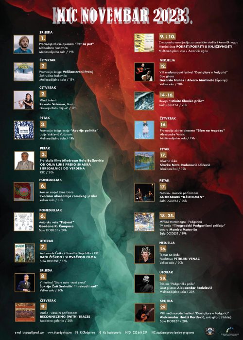 U okviru redovnog književnog programa KIC-a 1. novembra biće predstavljena nova knjiga poezije Slobodana Ivanovića ,,Pet sa pet“. KIC će takođe u saradnji sa Crnogorskom asocijacijom za američke studije ,,dr Biljana Milatović“ i Američkim uglom 9. novembra organizovati promociju knjige ,,Mit i stereotip u djelima Williama Faulknera“ dr Biljane Oklopčić, a dan kasnije biće održan naučni skup na temu ,,Pokret/pokreti u književnosti“, ali i promocija knjige ,,Književnost bez granica“ dr Selme Raljević. U KIC-u će 16. novembar biti promovisana i treća zbirka poezije Aleksandre Vujisić ,,Slon na trapezu”.