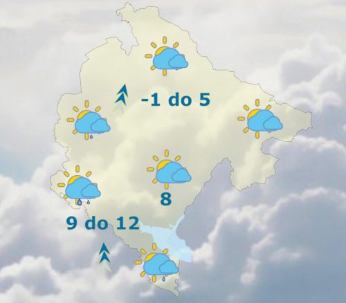 U Crnoj Gori danas će biti jutro pretežno vedro, ponegdje uz umjerenu oblačnost i hladno, na sjeveru uz jak mraz, po kotlinama magala ili niska oblačnost. Tokom dana postepeno jače naoblačenje sa zapada, koje će u drugom dijelu dana tek ponegdje, a kasnije tokom noći u većem dijelu zemlje usloviti kišu, a u višim predjelima snijeg, koji će tokom noći prelaziti u susnježicu i kišu. Vjetar južnih smjerova, slab do umjeren, u popodnevnim satima u pojačanju, mjestimično umjeren do jak, uveče ponegdje na udare i veoma jak. Najviša dnevna temperatura vazduha od -1 do 12 stepeni, kazali su iz Zavoda za hidrometeorologiju.
