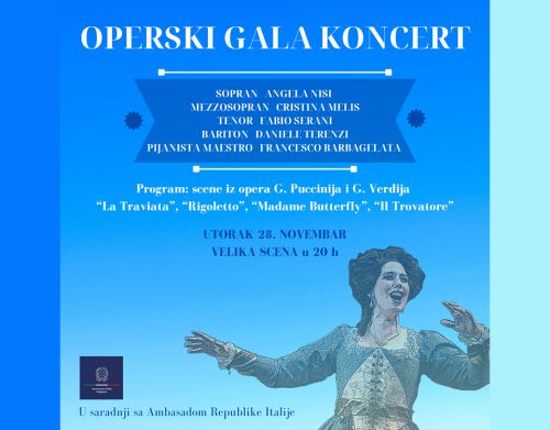 Operski gala koncert referentnih italijanskih umjetnika biće izveden večeras na Velikoj sceni Crnogorskog narodnog pozorišta s početkom u 20 sati, u okviru programa obilježavanja jubileja 70 godina postojanja nacionalnog teatra. Koncert se realizuje uz podršku Ambasade Republike Italije u Crnoj Gori, a sve ulaznice su rasprodate, saopšteno je iz PR službe CNP-a.