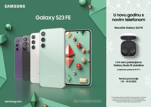 Galaxy S23 FE je sada dostupan za prednarudžbinu po preporučenoj maloprodajnoj cijeni od 729 EUR. Prilikom prednarudžbine ovog pametnog telefona dobijate i poklon – Galaxy Buds FE slušalice. Promocija traje od 1.12. do 14.12.2023 ili do isteka zaliha. Više informacija možete pronaći na linku.