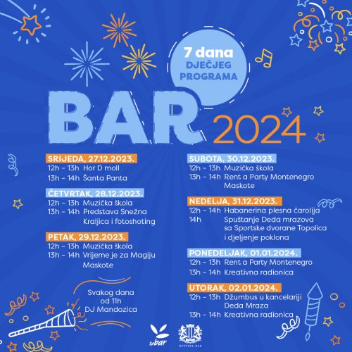 Turistička organizacija Bar donosi čaroliju praznične sezone kroz sedmodnevni Dječji novogodišnji program, od 27. decembra do 2. januara, sa početkom u 11 časova.