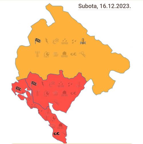 Danas je u Crnoj Gori crveni meteoalarm izdat za primorje gdje se očekuju udari vjetra >90km/h i talasasto more (Daglasova skala četiri do pet). Crveni meteoalarm je na snazi i u centralnom dijelu, gdje se, takođe, očekuju udari vjetra >90km/h. Narandžasti meteoalarm je u kontinentalnim i planinskim djelovima sa očekivanim udarima vjetra >50km/h i temperaturom nižom od jednog stepena Celzijusa.