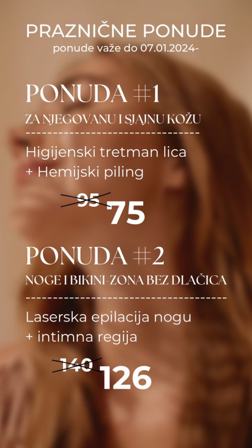 U salonu ljepote Beauty Room by Ljubica, u toku su praznične ponude i popusti. Od brojnih tretmana koje rade u ovom salonu, izdvojili su ponudu koja se odnosi na njegovanu i sjajnu kožu i podrazumijeva higijenski tretman lica plus hemijski piling po cijeni od 75 eura (prethodna cijena 95 eura). Druga ponuda odnosi se na lasersku epilaciju nogu i intimne regije- cijena je 126 eura (prethodna 140 eura).