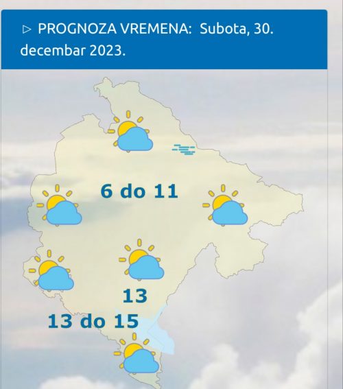 Danas će u Crnoj Gori biti umjereno do pretežno oblačno, uz nešto sunčanih perioda. Na sjeveru po kotlinama duže zadržavanje magle ili niske oblačnosti, a u planinama više sunčanih intervala. Vjetar uglavnom slab promjenjivog smjera. Najviša dnevna temperatura vazduha od 6 do 15 stepeni, saopšteno je iz Zavoda za hidrometeorologiju.